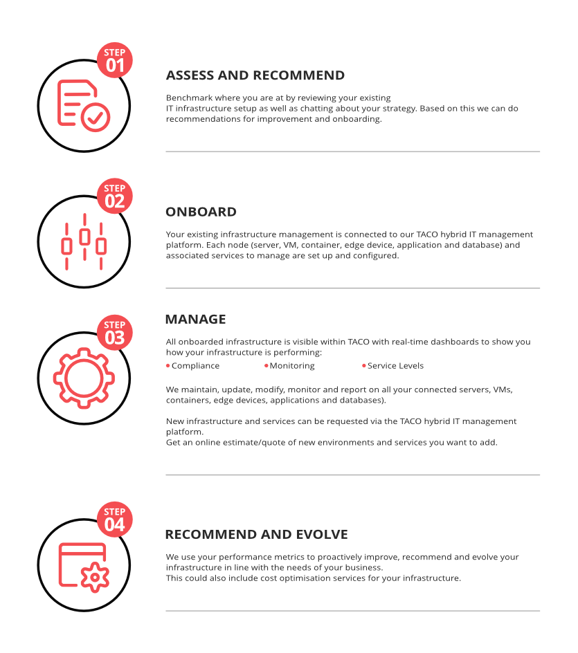 We are an extension of your IT team responsible for infrastructure, application, database and log management for all your IT management needs. Our role is to keep your infrastructure compliant, secure, updates and patched, for on-premise, cloud or edge solutions.